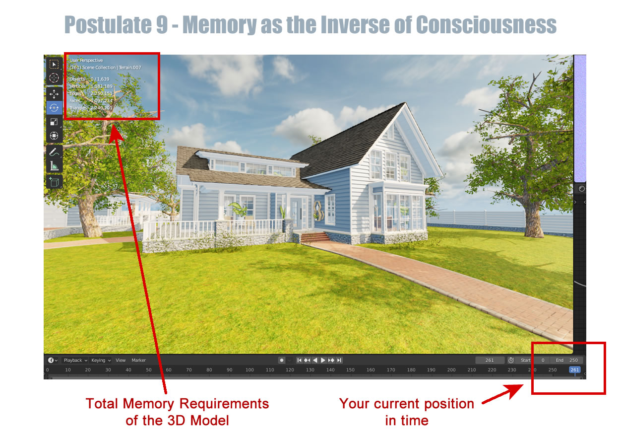 Here is the same model only surrounded by the control panels of Blender software. Blender software contains all the tools needed to construct the model. In the human mind, reality is modeled on the fly as it presents itself. This model contains 1639 objects, 2.25 million edges, and 1.1 million faces. All this is contained in less than 1 gigabyte of memory. I do believe the mind uses geometry to convert space to memory, or some derrivation of it. These memory requirements are nothing the human mind couldn't handle. Here is how the two models of life differ in their interpretation of physical space: