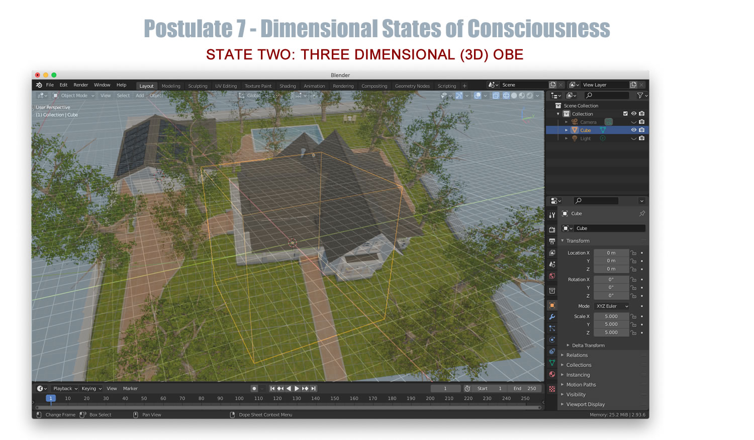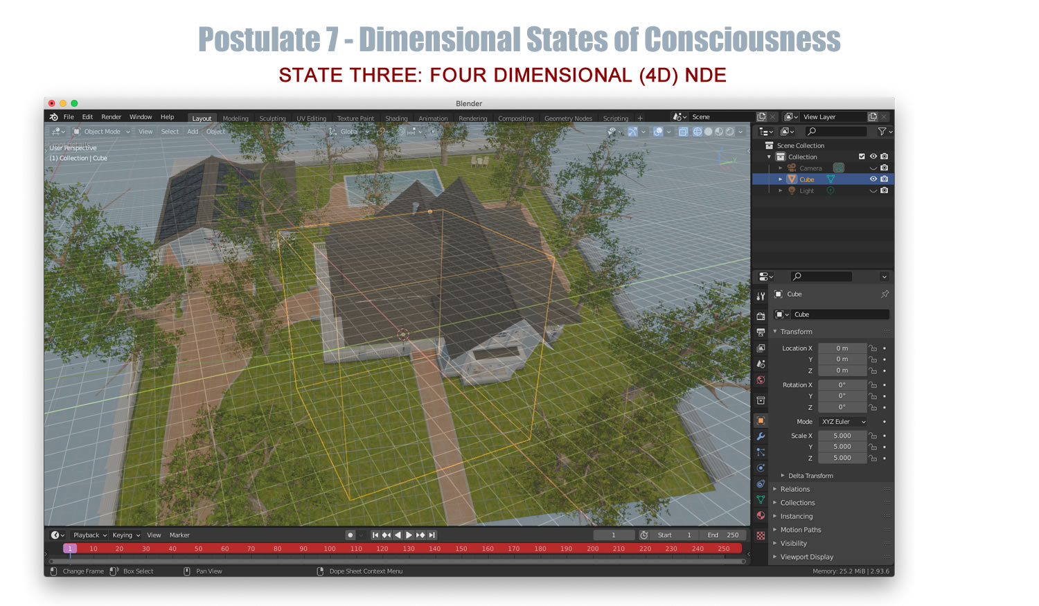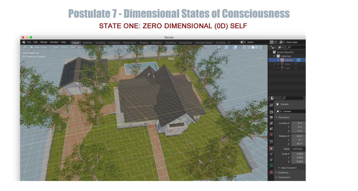 Blender 3D software provides a powerful visual platform to illustrate the postulates and geometric concepts of Afterlife Theory by translating abstract multidimensional ideas into tangible simulations. Using its modeling, animation, and rendering tools, Blender can represent the transition of consciousness from a 0D point of self to 3D space during out-of-body experiences, and further into 4D space-time in the afterlife. Geometric constructs such as points, vectors, and hypersurfaces can be visualized dynamically, allowing observers to explore the expansion of awareness, the encoding of memory, and the flow of information in higher dimensions. Animations of these transformations can make the theory's postulates concrete, showing how consciousness navigates, interacts with, and perceives these dimensions, effectively bridging the gap between theoretical abstraction and experiential comprehension.