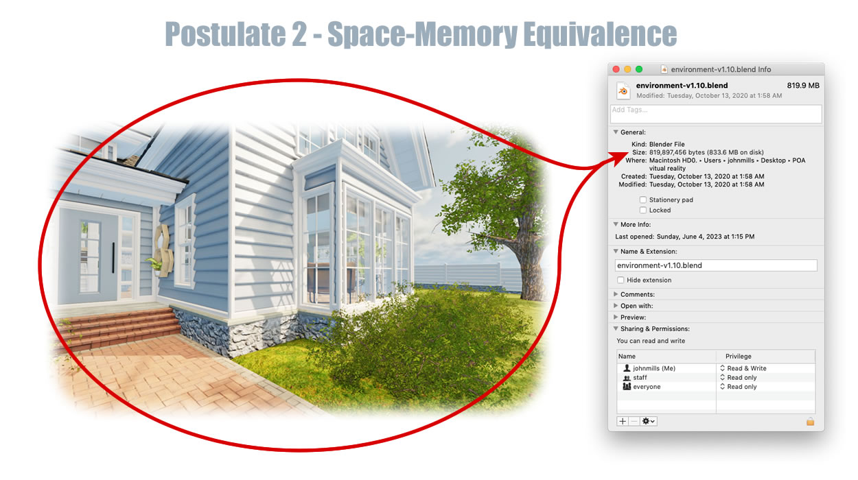 Ironically, the author refers to the real world to differentiate from the virtual world. The purpose of this section is to show how the real world could conceivably be the real world. A major assertion of proof of afterlife is the mind extends out, beyond the body, to the limit of the environment. The idea is to mentally conceive of the real world as a model like this within memory. This scene uses just 833 megabytes of memory. It is possible that a three-dimensional model, like this one could exist within the mind's memory. It is within memory where the environment is realized. The real-world model would be better and more complete, but you can see by looking at this that such a model within memory could be possible.