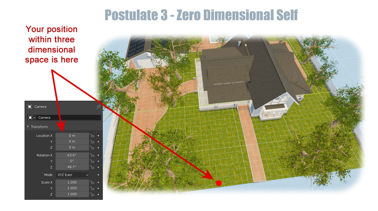 3D software is much more precise in its representation of awareness. Awareness, in 3D software, is the camera. The camera is live, meaning it is active and perceives the environment. Likening human awareness to the camera allows us to be more focused and precise in our interpretation. First, awareness is located at a specific point within the environment. It has a specific X, Y, and Z coordinate location. Second, it has a specific location within time. Third, in terms of its size, awareness is a single point. As you can see in the "Location in Space" panel above, awareness is located at a point within the environment. In the awareness/memory model, awareness is defined as a single point of view within the environment.